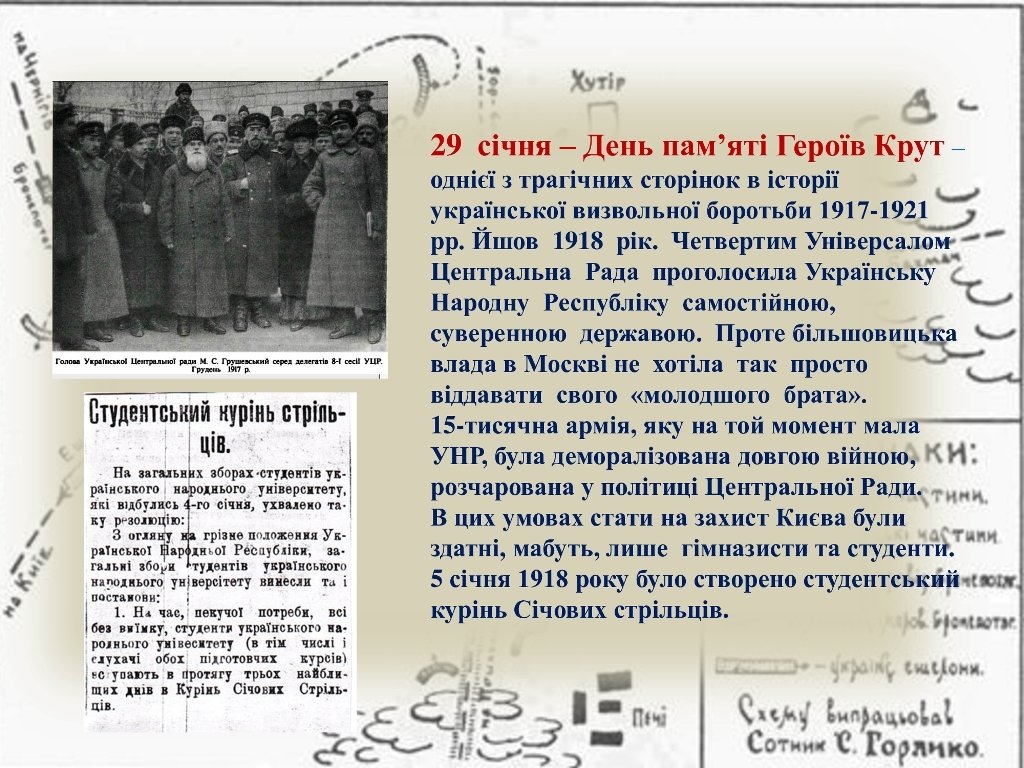 29 січня українці вшановують події кінця січня 1918 року, коли юні захисники Української Народної Республіки власною кров’ю вписали нову героїчну сторінку в історію українського визвольного руху — бій під Крутами.