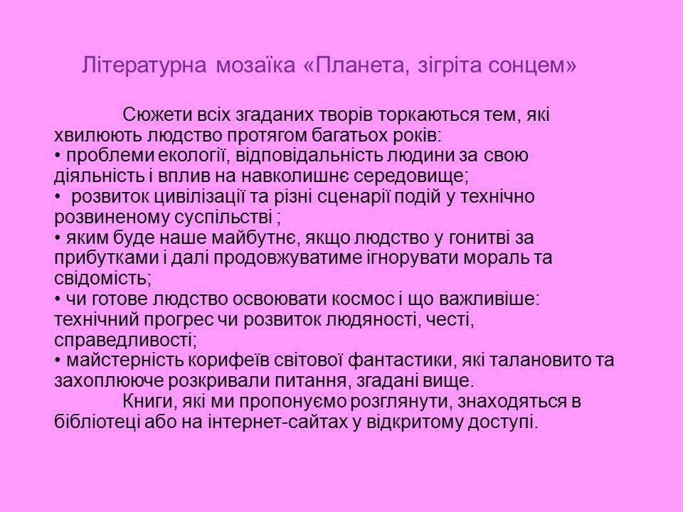 У фантастичних творах зазвичай героїв відправляють у далекі глибини космосу. Але в які б неймовірні часи майбутнього чи минулого не відправляли автори своїх героїв, у творах йдеться завжди про людину Землі, вічні питання буття. Бо ми - діти планети, що зігріта сонцем. Бо від нас залежить власне майбутнє і майбутнє всієї планети.
