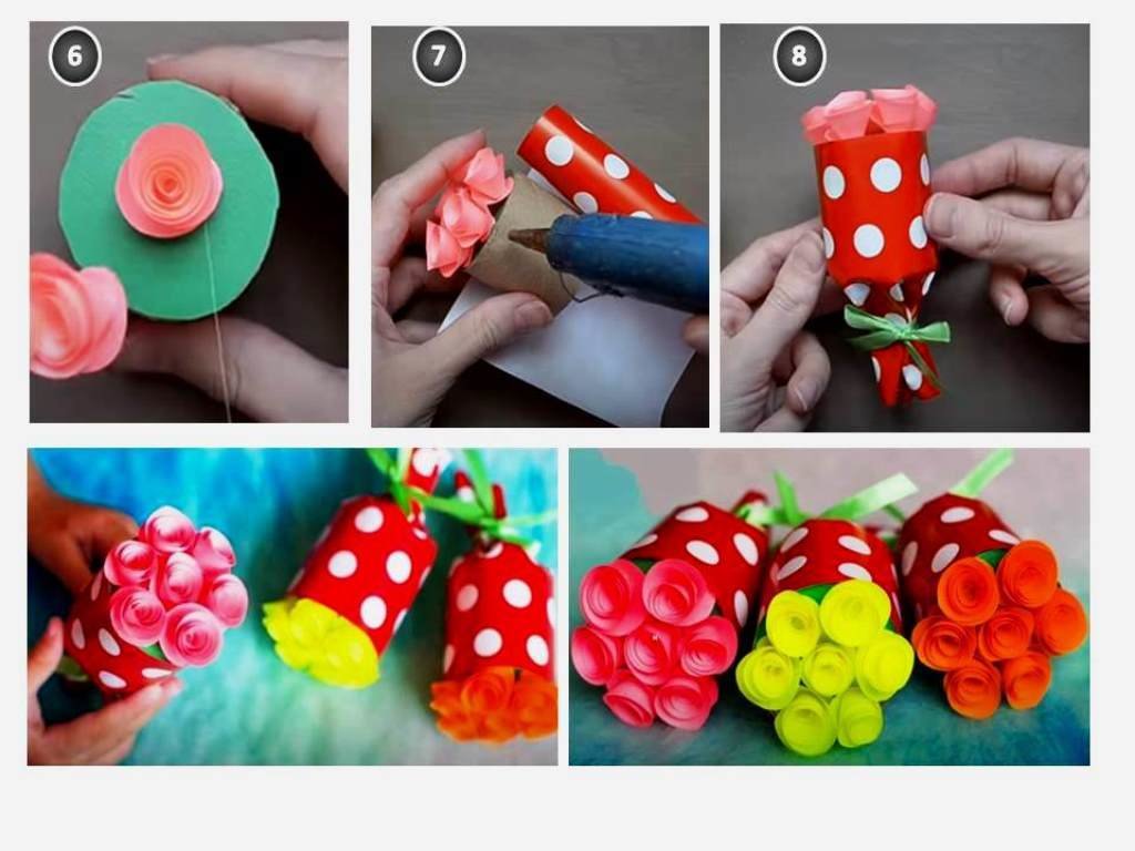Подарунок для ласунів можна прикрасити улюбленими цукерками. Якщо Ви любите читати й складати розповіді, можете спробувати написати святковий вірш, записати в листівку або розповісти його напам'ять. Такий букетик буде відмінним подарунком до 8 Березня своїми руками, що виражає почуття й емоції та є проявом любові!