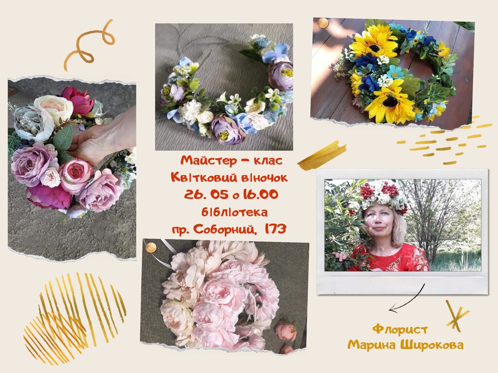 26 травня о 16:00 у бібліотеці Вознесенівського району (проспект Соборний, 173) відбудеться майстер-клас із виготовлення «Квіткового віночку» за участю фахівчині з флористики – Марини Широкової (матеріали надаються майстринею).