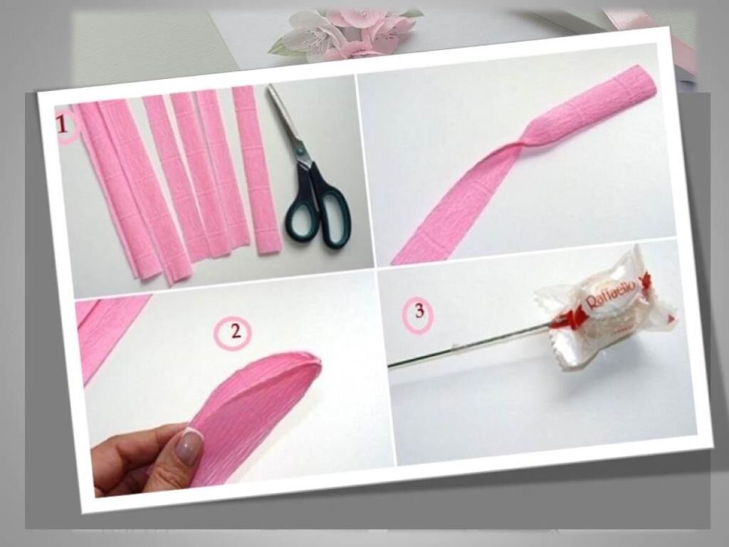 4. Зберіть бутон тюльпана таким способом: візьміть перший пелюсток і прикріпіть його на скотч. Другий і третій пелюстки розташуйте біля цукерки і, притримуючи пальцями, зафіксуйте тейп-стрічкою.