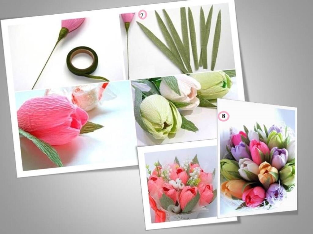 7. Тюльпан готовий! Зробіть потрібну кількість тюльпанів різних кольорів. Сформуй із тюльпанів букет.