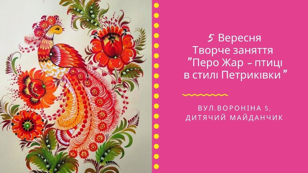 05 вересня 2020 року о 10:30 на дитячому майданчику біля бібліотеки по вул. Вороніна, 5 (Шевченківський район) відбудеться друге заняття творчої студії «Від хобі до майстерності» з петриківського розпису «Перо Жар-птиці в стилі Петриківки».