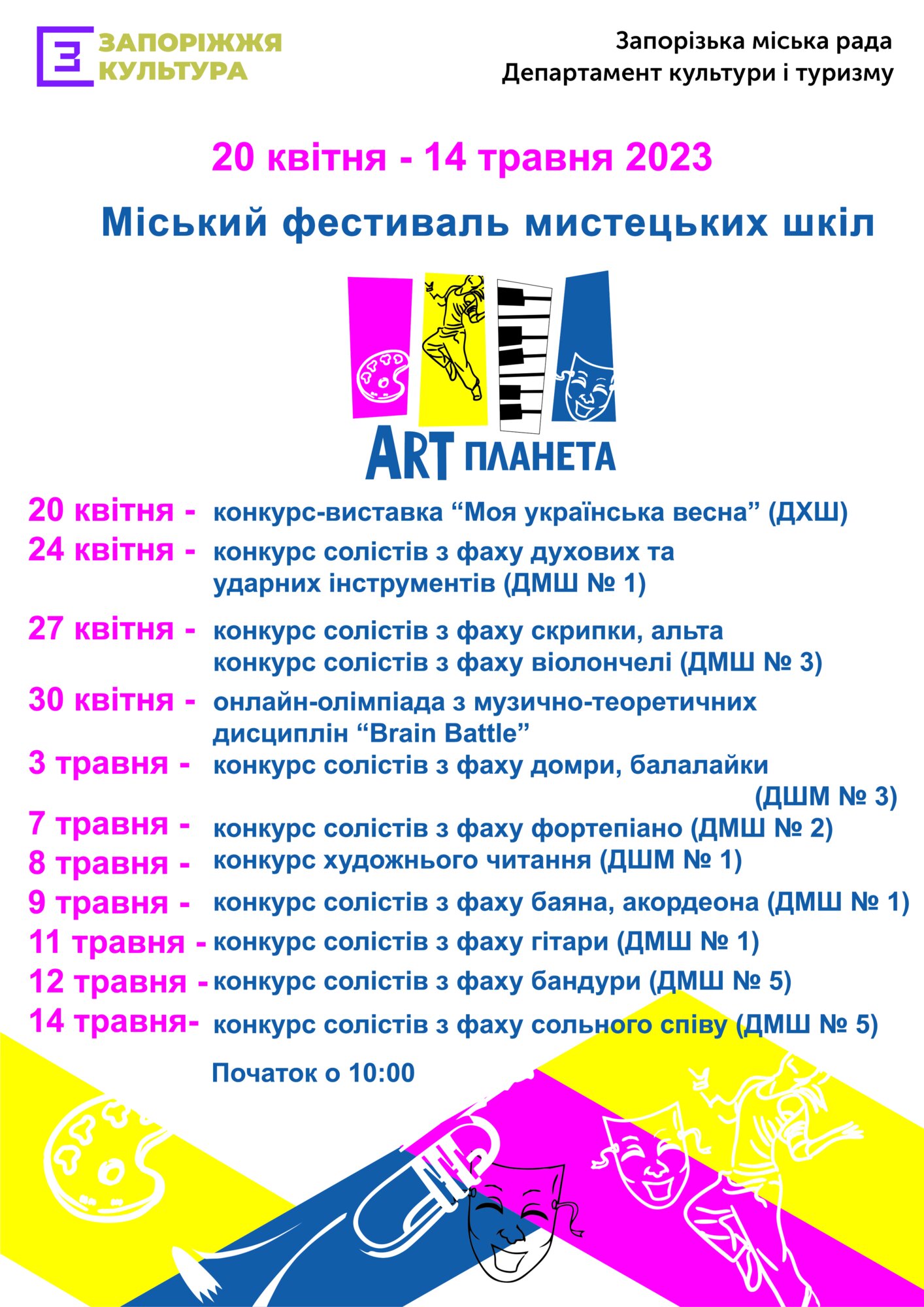 З 21 квітня по 14 травня у Запоріжжі триватиме міський фестиваль «Art-планета». Захід об’єднує 12 конкурсів з музичного, театрального та образотворчого мистецтва серед учнів мистецьких шкіл.