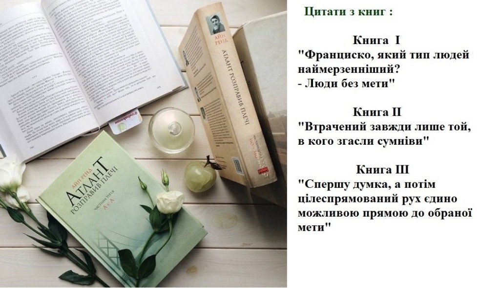 Власне, весь «Атлант…» побудований на філософії об’єктивізму і любові до правильного чесного капіталізму. Повчальний зміст книги дуже глибокий: вона вчить цінувати себе і свою працю, але не очікувати чогось задарма, не скаржитися на тих, хто вже чогось досяг, відчуваючи до себе жалість.