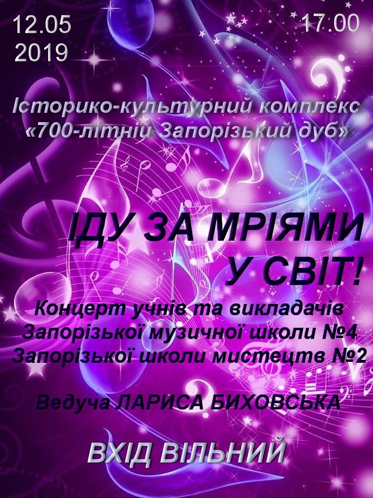12 травня на території історико-культурного комплексу «700-літній Запорізький дуб» (вул. Тараса Бульби, 14) відбудеться концерт «Іду за мріями у світ!», в якому візьмуть участь учні та викладачі дитячої школи мистецтв №2 та музичної школи №4.