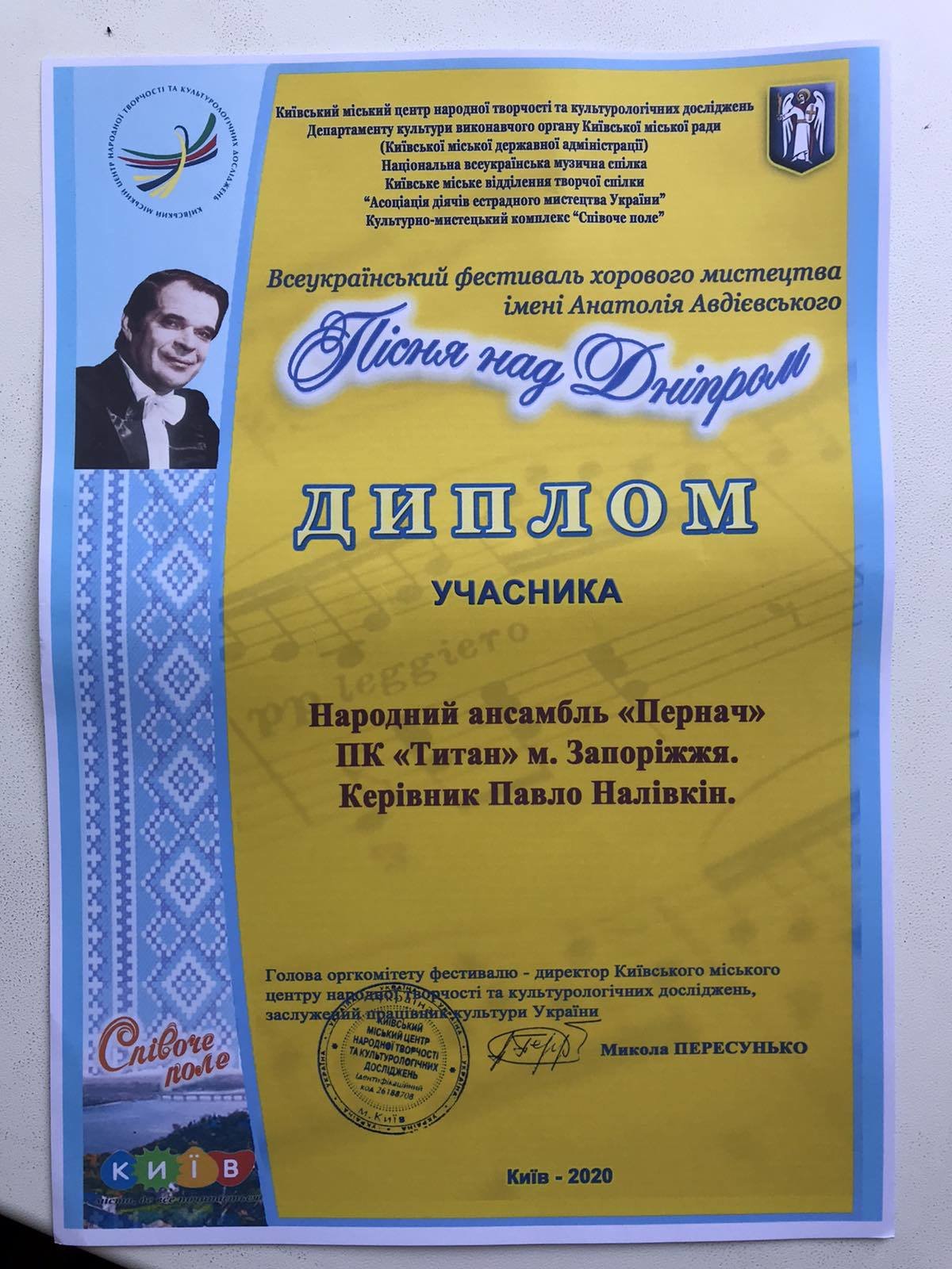 Народний ансамбль «Пернач» палацу культури «Титан» взяв участь у Всеукраїнському фестивалі хорового мистецтва імені Анатолія Авдієвського «Пісня над Дніпром».