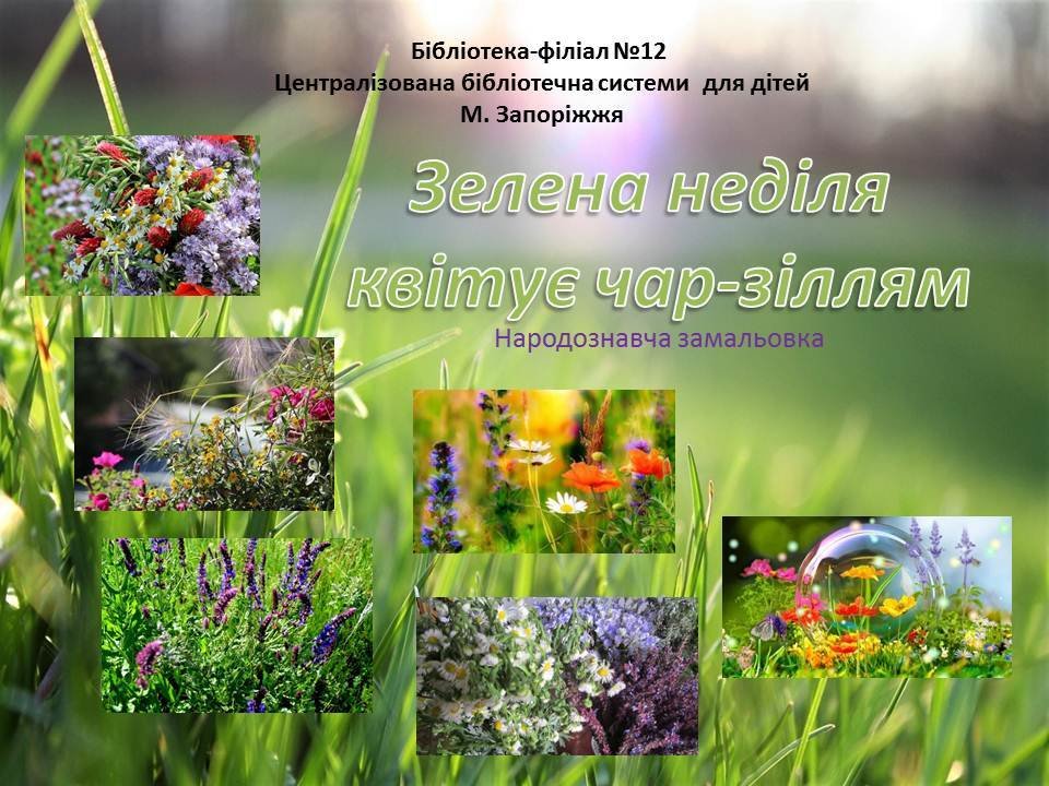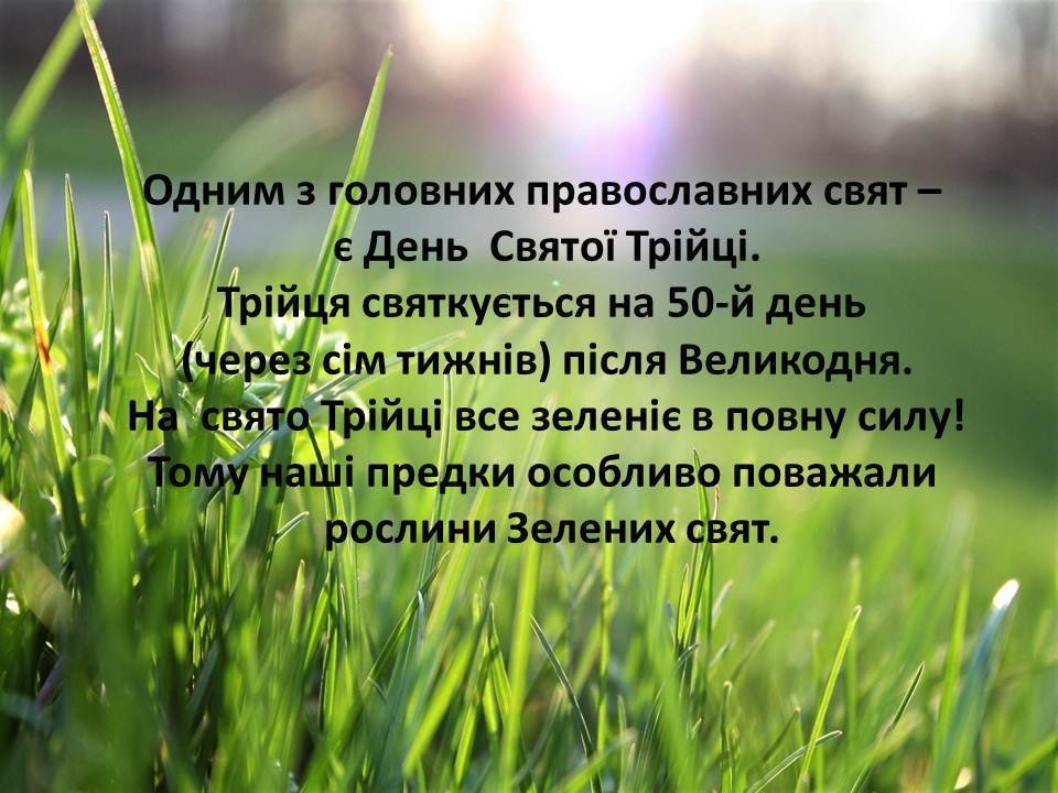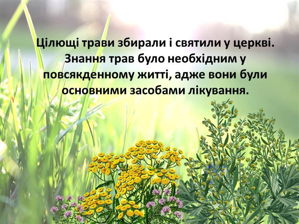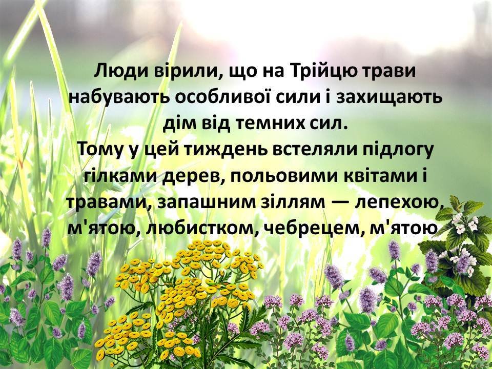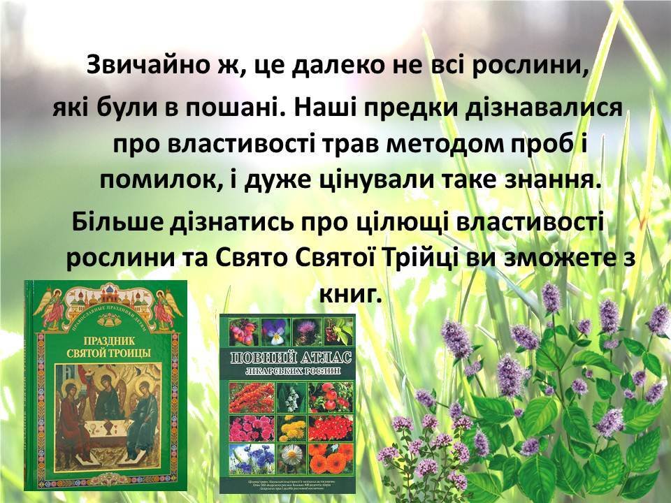 Про цілющі властивості різноманітних трав вам розповість наша презентація - народознавча замальовка «Зелена неділя квітує чар-зіллям», присвячена чудовому святу Трійці.