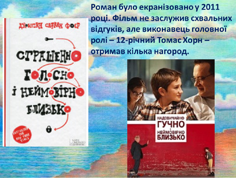«Страшенно голосно і неймовірно близько», Джонатан Фоєр: «Батьки завжди знають більше за дітей, а діти завжди розумніші за своїх батьків». Розповідь в романі ведеться від імені хлопчика Оскара, який мешкає в Нью-Йорку. Його батько, Томас Шелл, завжди вигадував для сина різні загадки. Однак тепер, коли батько загинув під час катастрофи 11 вересня 2001 року, Оскару доведеться розгадати останню головоломку тата самотужки…