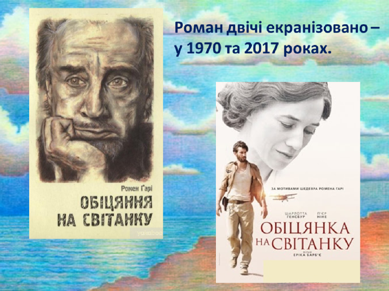 «Обіцянка на світанку», Ромен Гарі: «В твоєму житті ніколи не буде жінки, яка любила б тебе так, як вона». Це реальна історія матері, що ніколи не здається, і сина, який прагне будь що виправдати її сподівання. Попри важкі часи і тяжкі випробування (події розгортаються в Польщі і Франції, на тлі Другої світової війни та повоєнних років), вони залишалися вірними своєму кровному і духовному зв’язку, пронісши крізь все життя любов і вдячність одне одному. Ромен Гарі – французький письменник єврейського походження, в романі багато автобіографічних елементів, він прославляє матір, яка завжди підтримувала сина і вірила в його велике майбутнє.