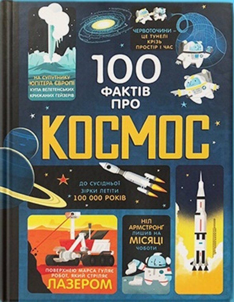 Авторів книжки «100 фактів про космос» можна сміливо називати популяризаторами науки, адже після її прочитання жодна дитина більше не повірить тому, що «Сонечко лягає спати», а зірки можуть падати з неба. Весела, дотепна та дуже змістовна – ця книжка подає відомості про історію вивчення космосу, розташування у Всесвіті Землі, утворення Сонячної системи, дослідження планет роботами тощо. Книжка містить цікавинки, про які не дізнаєшся навіть у школі. Скільки сміття на Місяці залишила команда «Аполона-11» після висадки на нього? З чого розпочати колонізацію Марса? Скільки жінок і чоловіків брали участь в польотах за межі Землі? Що робили в космосі плодові мушки й тихоходи? «100 фактів про космос» дивуватимуть як юних читачів, так і їхніх батьків.