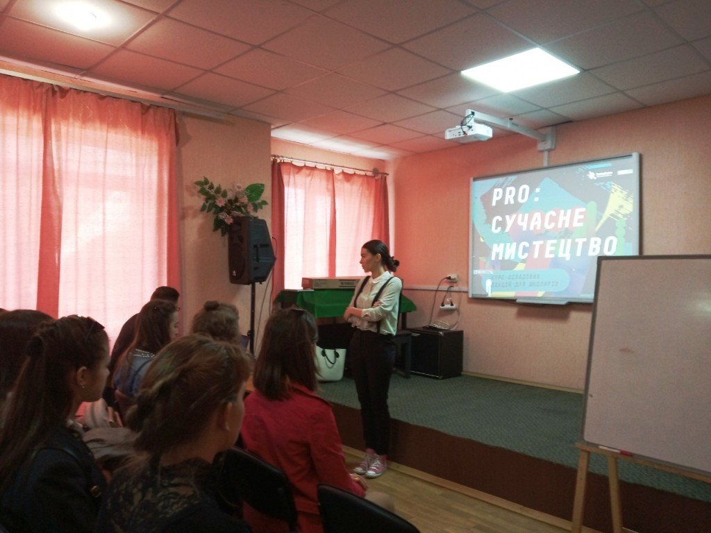 Олена Сперанська – pr-спеціаліст у сфері сучасного мистецтва. Вона познайомила учнів та викладачів школи з напрямками та течіями у сучасному мистецтві, з творчістю відомих українських митців, розповіла, де все це можна побачити, обмінюватись досвідом та знаходити натхнення. Зацікавленість викликали у слухачів інформація про сучасні мистецькі професії: перформера, стріт-артиста, галериста, арт-ділера, критика тощо.