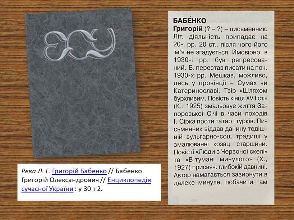 Про Григорія Бабенка, автора захопливих історичних повістей, досі було невідомо нічого – ні коли народився, ні коли помер. І тільки останнім часом вдалося кинути дрібку світла на цього непересічного автора. У 1911 році він закінчив Харківський університет, ще замолоду став цікавитися історією, навіть листувався з Дмитром Яворницьким.