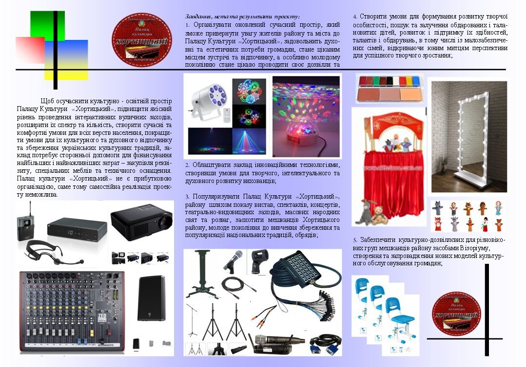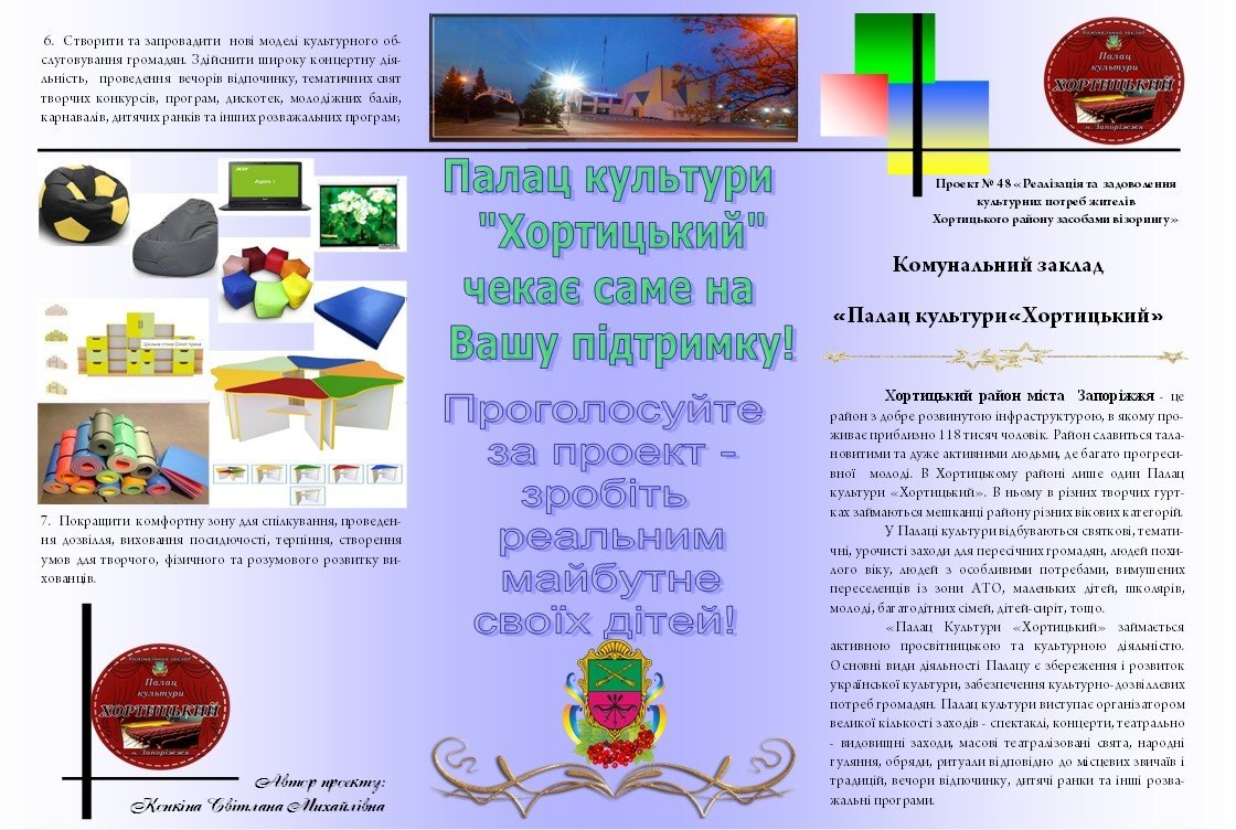 Цього року за ініціативи небайдужих містян у конкурсі Запоріжжя бере участь проєкт № 48 - «Реалізація та задоволення культурних потреб жителів Хортицького району засобами візорингу». Він спрямований на створення оптимальних та комфортних умов для роботи творчих колективів палацу шляхом придбання нового сучасного обладнання театральної студії.