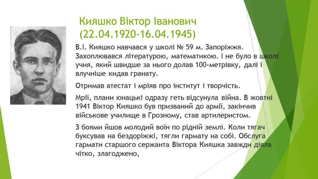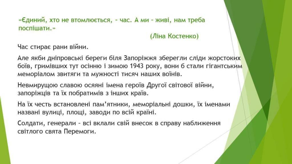 Презентація присвячена відомим і невідомим героям Другої світової війни, які визволяли наше рідне Запоріжжя від фашистських загарбників. Ці Солдати Перемоги були різних національностей, родом з різних країн, але їх об’єднувало величезне прагнення врятувати Батьківщину від поневолення. Їх імена вкарбовані в пам’ятниках та назвах вулиць нашого міста.