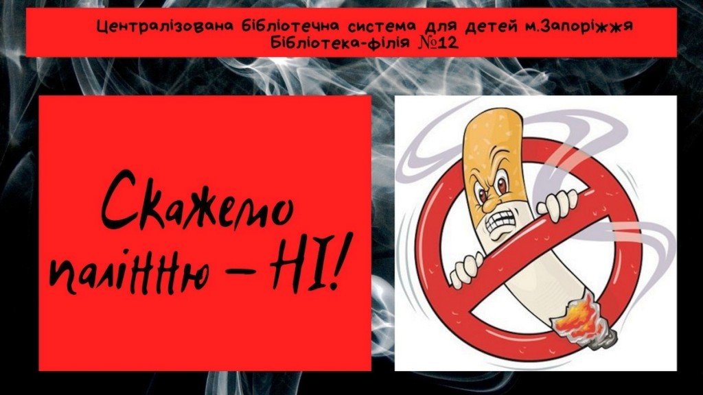 До Всесвітнього дня без тютюну, який щороку відзначається 31 травня, бібліотека для дітей №12 (вул.Чарівна,143, Шевченківський район) пропонує перегляд презентації-застереження "Скажемо палінню – Ні!".