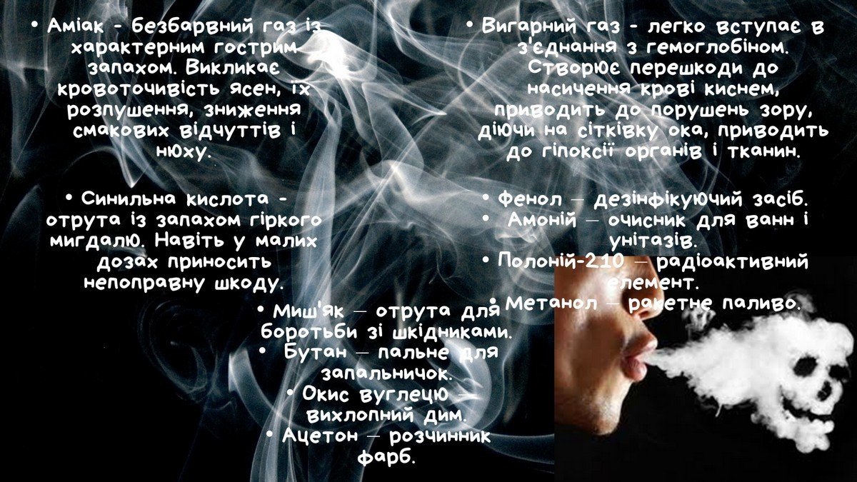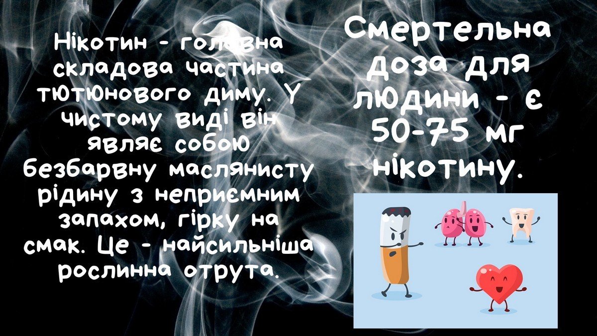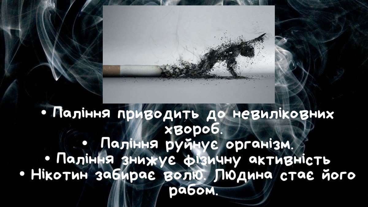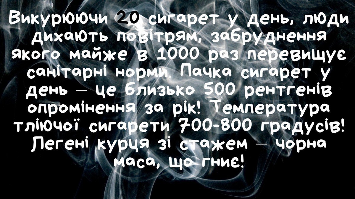 В ній ви знайдете інформацію, яка позбавить вас бажання викурити навіть одну цигарку. Пам'ятайте: крапля нікотину вбиває коня. Вибір за тобою!!!
