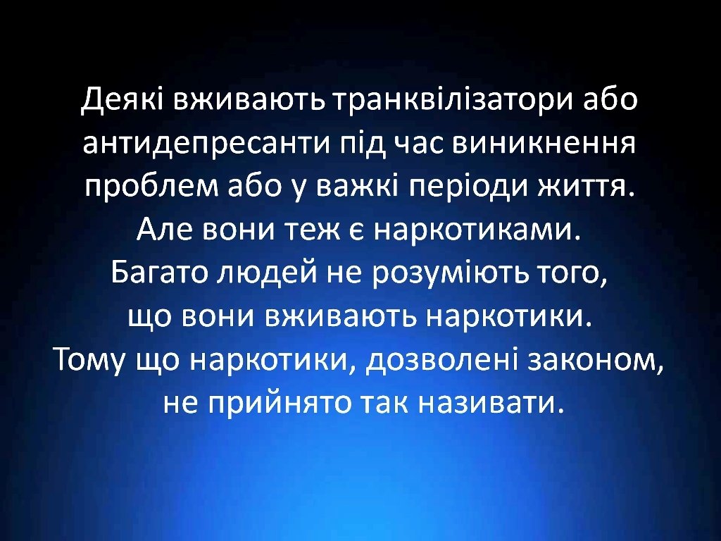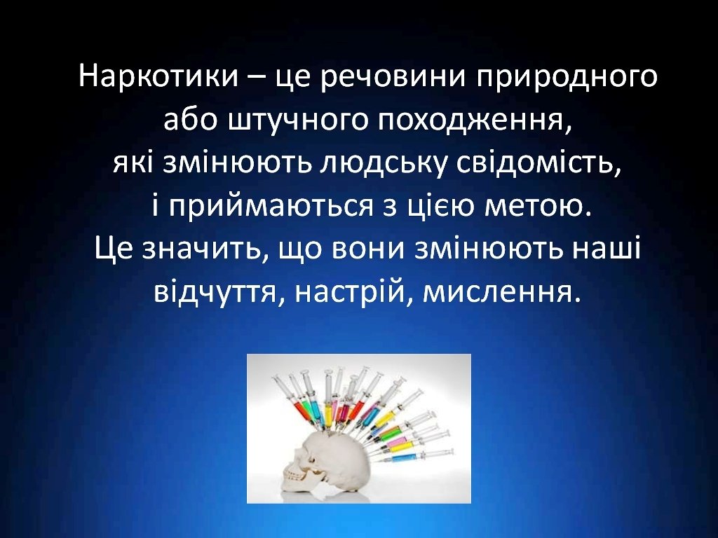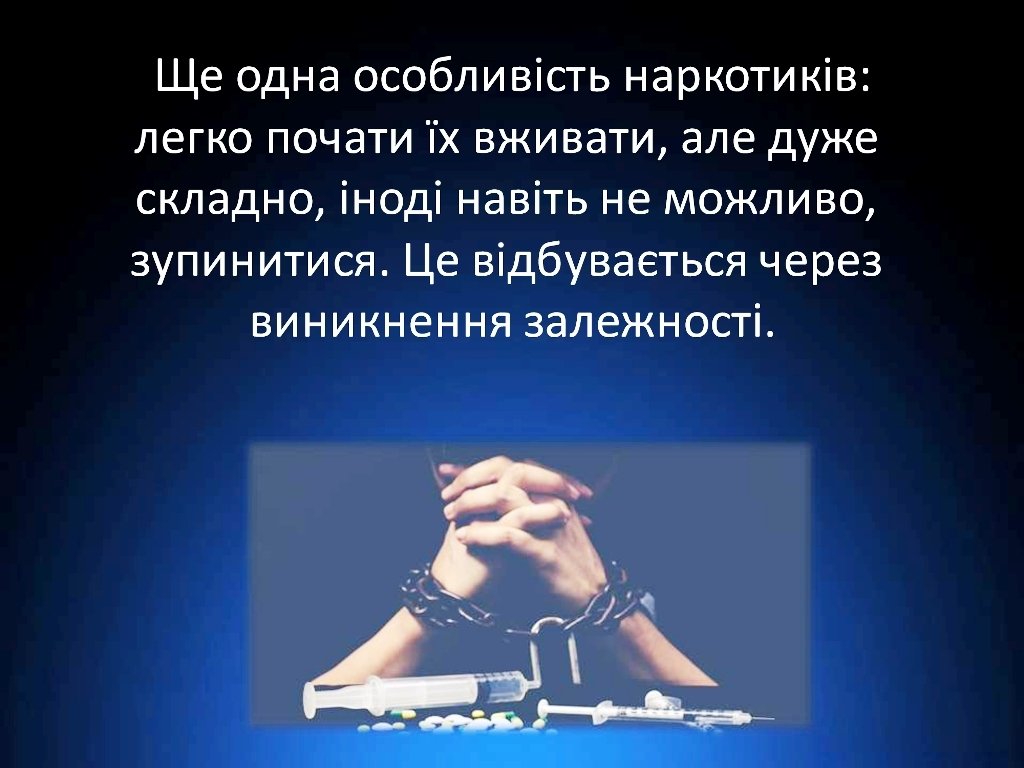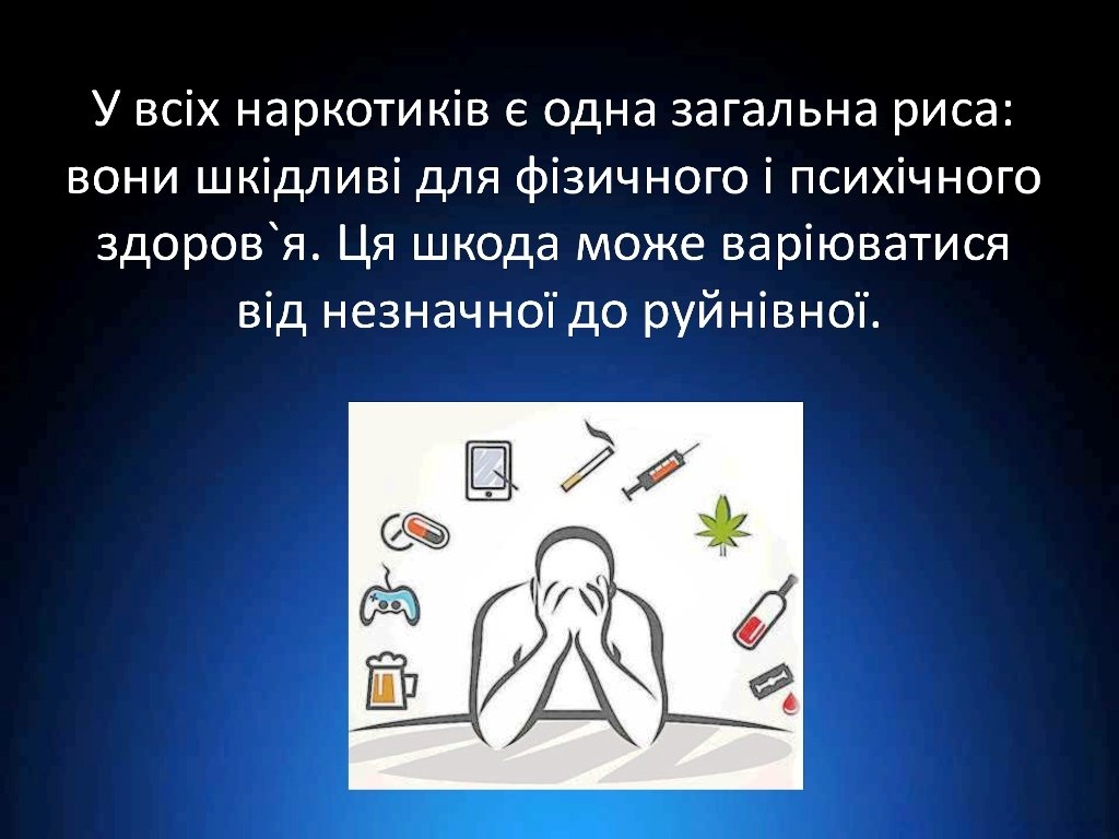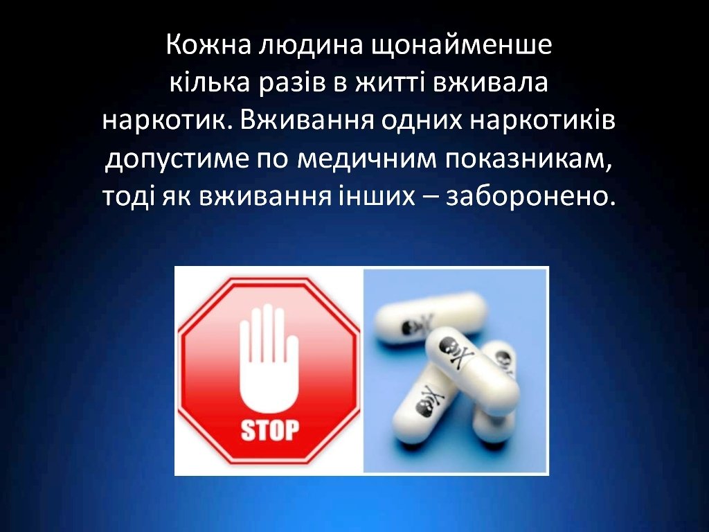 Наркоманія залишається важливою соціальною і медичною проблемою, оскільки наслідки цього явища мають згубний вплив на все суспільство. Основна мета профілактики наркоманії є формування у населення і, особливо, у молоді активної життєвої позиції неприйняття вживання наркотиків. Велике значення має організація дозвілля підлітків, створення умов, що забезпечують корисне проведення вільного часу.