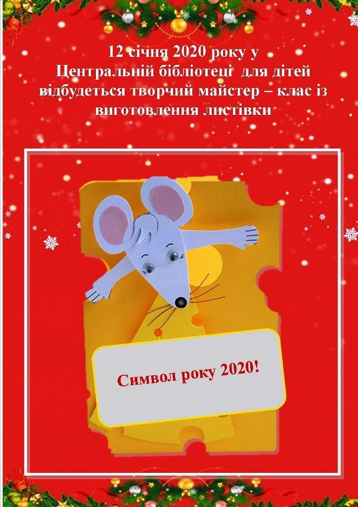 Бібліотекарі запропонують юним гостям виготовити власноруч яскраву листівку, присвячену символу 2020 року – миші. Діти також дізнаються цікавих фактів про гризунів, їх звички та життя в природі, візьмуть участь у пізнавальній вікторині, познайомляться з книгами за темою «Мишаче чтиво» та переглянуть захоплюючий мультфільм.