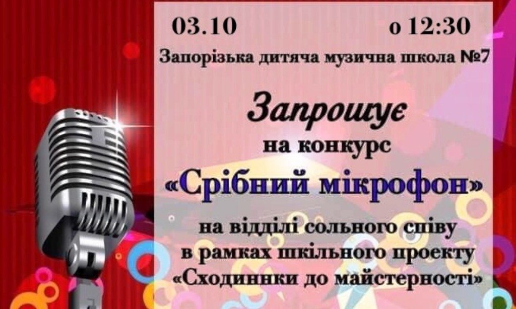 03 жовтня 2020 року о 12:30, у дитячій музичній школі №7, на відділі сольного співу, в рамках проєкту «Сходинки до майстерності» відбудеться шкільний конкурс «Срібний мікрофон».