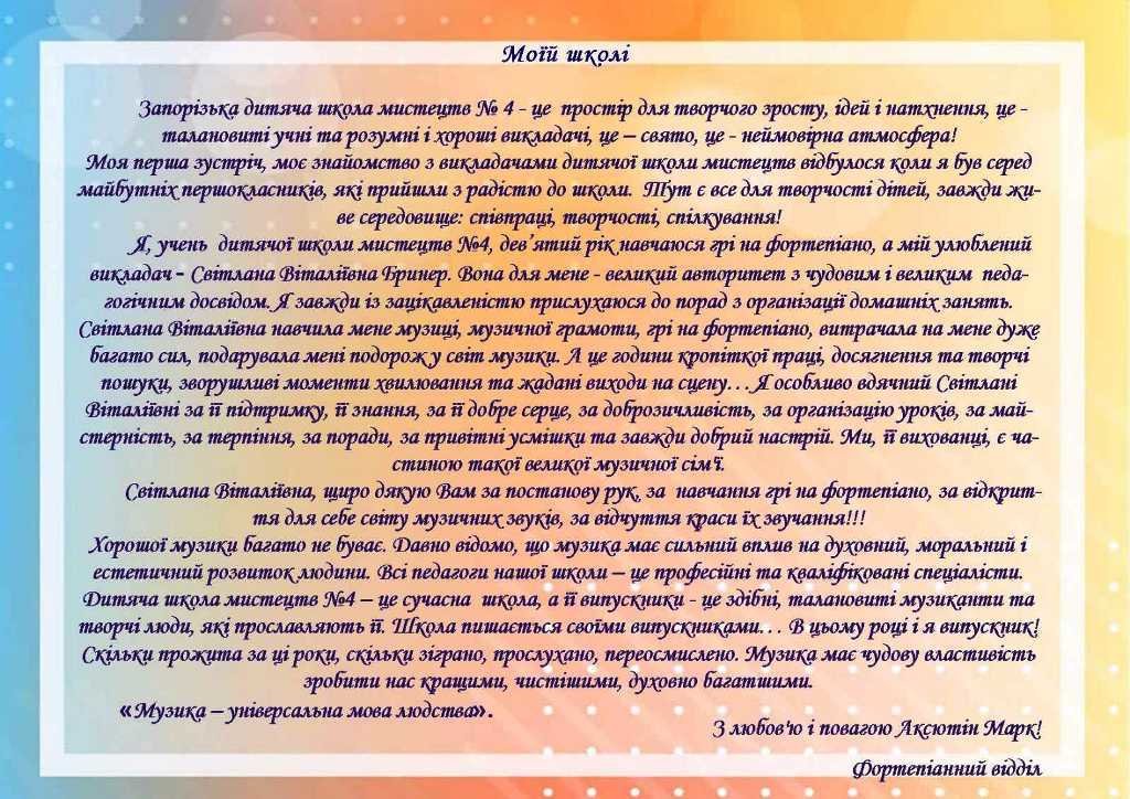 У 2020-му Запорізька дитяча школа мистецтв №4 святкує свій 30-річний ювілей! Саме з цієї нагоди у лютому поточного року було розпочато конкурс "Марафон вітань", де кожен бажаючий мав змогу проявити свої літературні здібності.