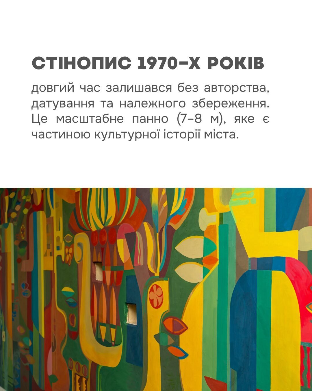 Стінопис зазнав значних пошкоджень — від втрат фарбового шару до тріщин і наслідків ремонту.