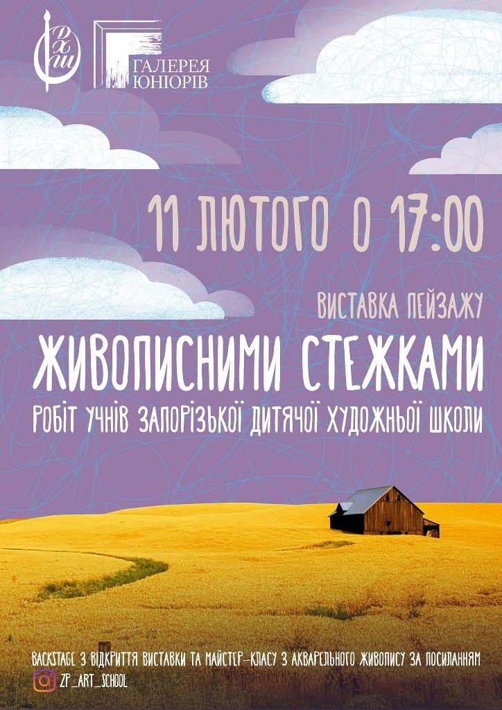 11 лютого 2021 року о 17 годині в «Галереї ЮНІОРІВ» Запорізької дитячої художньої школи (проспект Маяковського, 3а) відбудеться відкриття виставки творчих робіт учнів дитячої художньої школи (ДХШ) «Живописними стежками», яка розпочинає демонстрацію творчих досягнень учнівської молоді у 2021 році. На виставці експонуються 50 робіт авторів віком від 8 до 17 років.