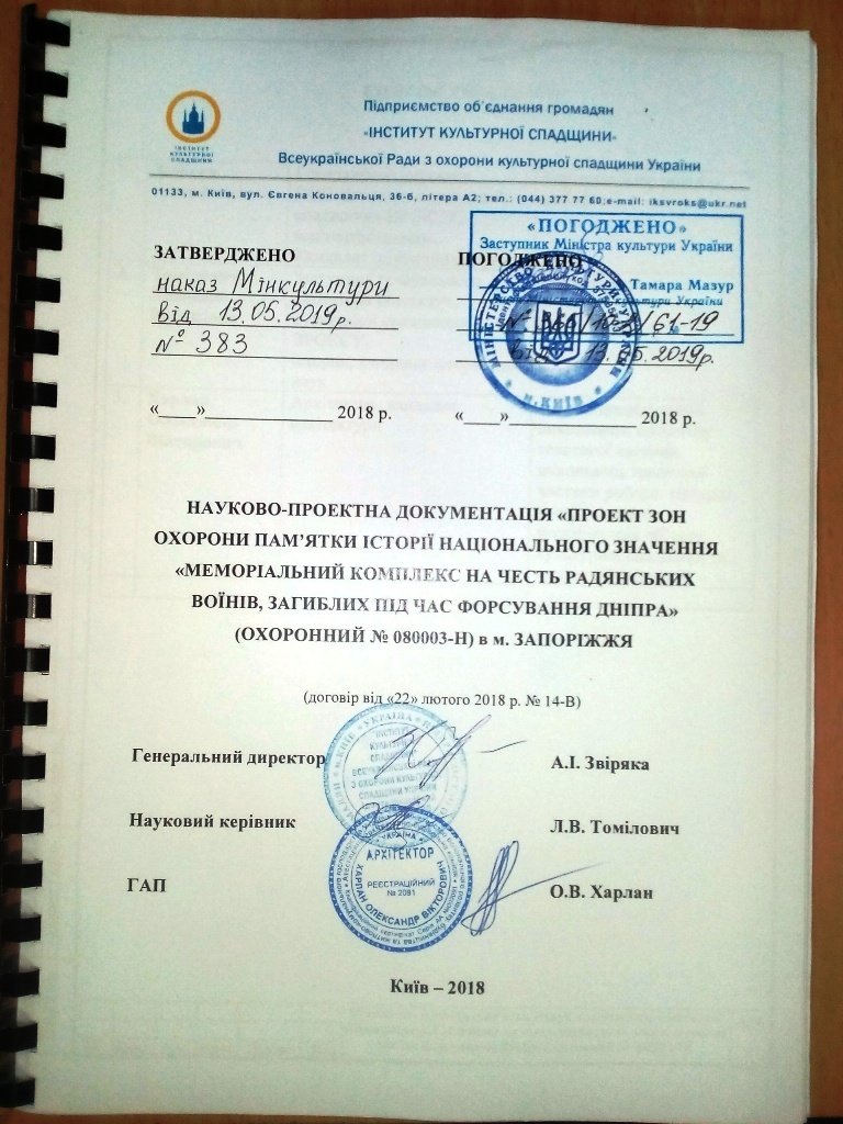 На виконання Програми охорони пам’яток історії та культури у м.Запоріжжі на 2018-2022 роки департамент культури і туризму міської ради забезпечив розроблення та затвердження органами охорони культурної спадщини науково-проектної документації із визначення зон охорони пам’яток історії та культури.