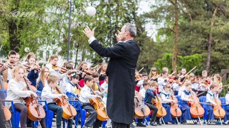 Більш ніж 120 учасників – юних скрипалів та віолончелістів із 12-ти шкіл мистецтв – виконають під відкритим небом на сходах Запорізької обласної філармонії (проспект Соборний, 183) уривок з «Оди до радості» Л. Бетховена. Ця музика стала гімном Європейської Співдружності, що об’єднує країни на засадах розуму, правди, добра і краси.