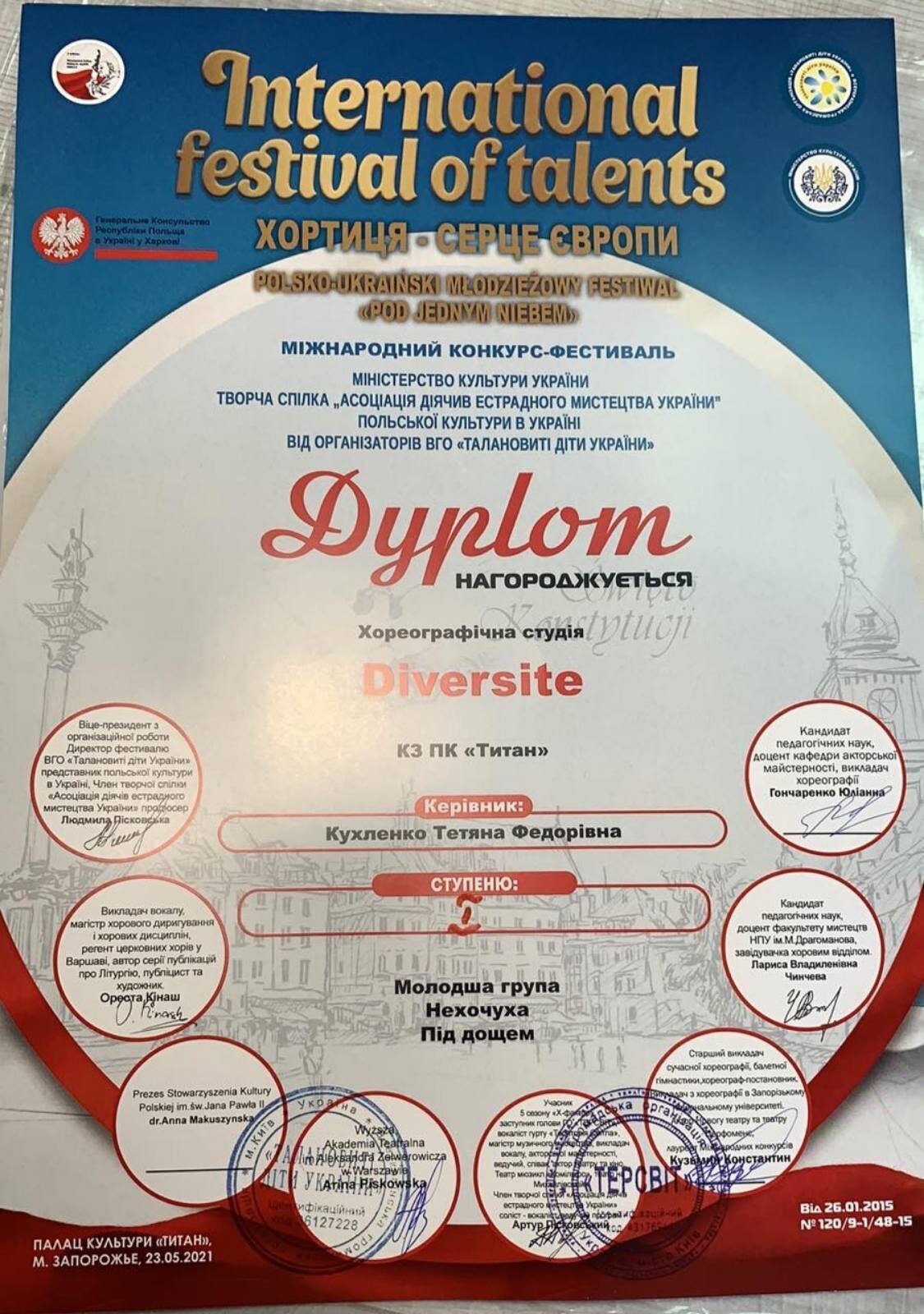23 травня у Запоріжжі відбувся Міжнародний конкурс-фестиваль «Хортиця-серце Європи». У фестивалі взяли участь 214 учасників, 13 колективів. До участі у конкурсі долучилися вихованці молодшої групи хореографічної студії «Diversite» (кер. Тетяна Кухленко) палацу культури «Титан». Учасники колективу представили на розсуд журі яскраві хореографічні номери «Нехочуха» та «Під дощем». За результатами конкурсу хореографічна студія «Diversite» здобула І місце.