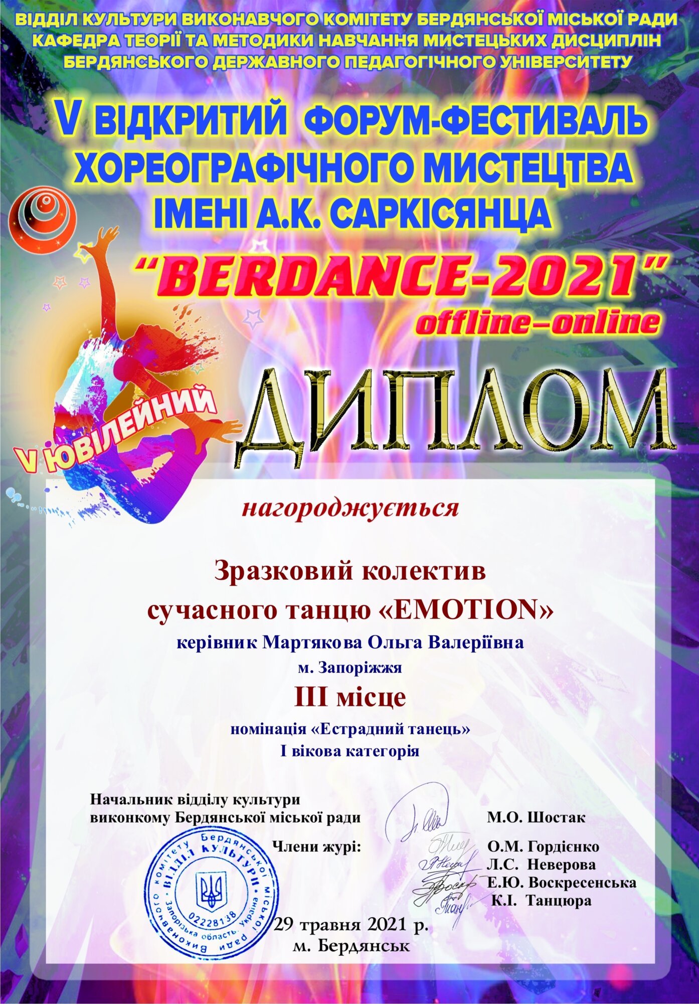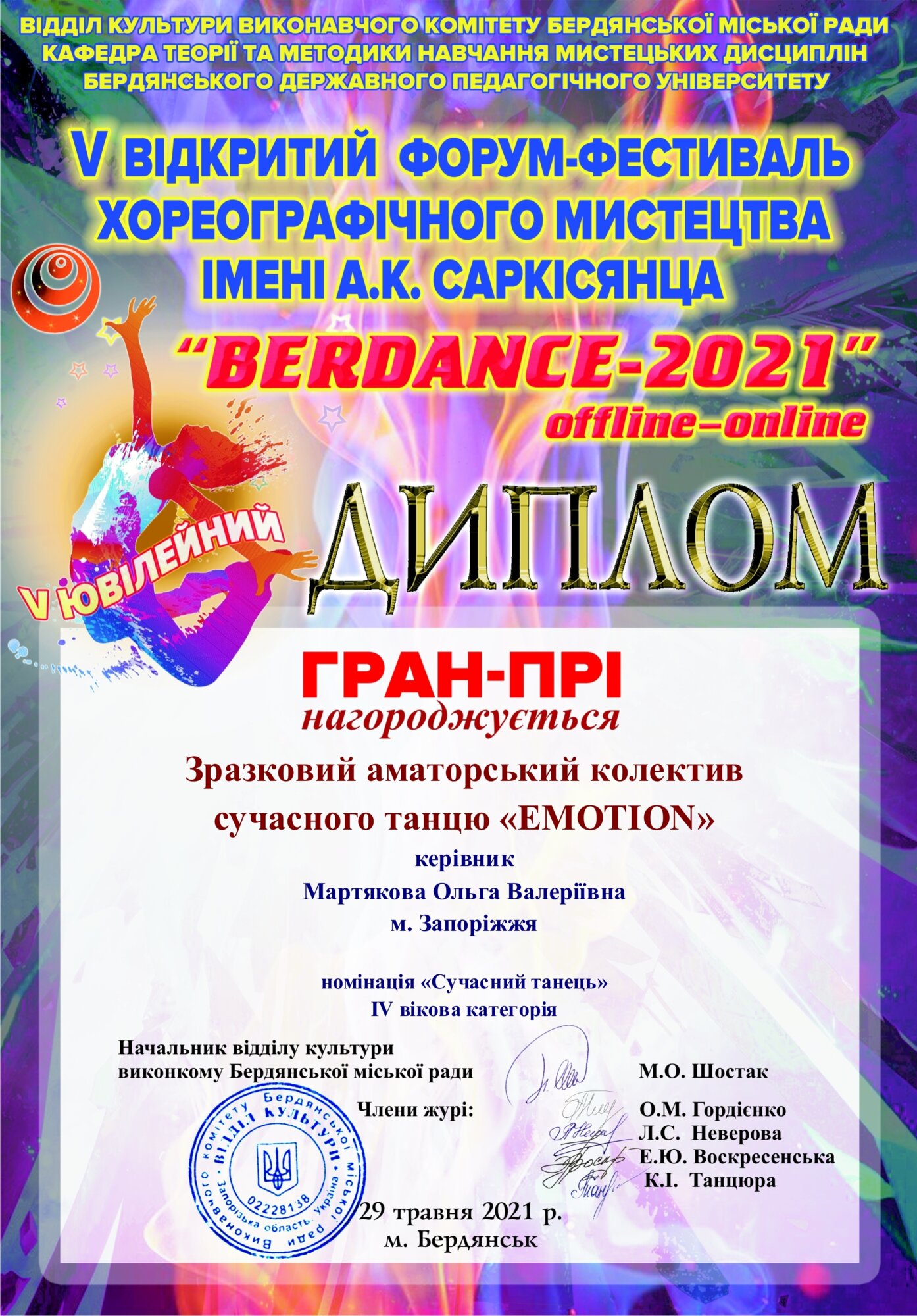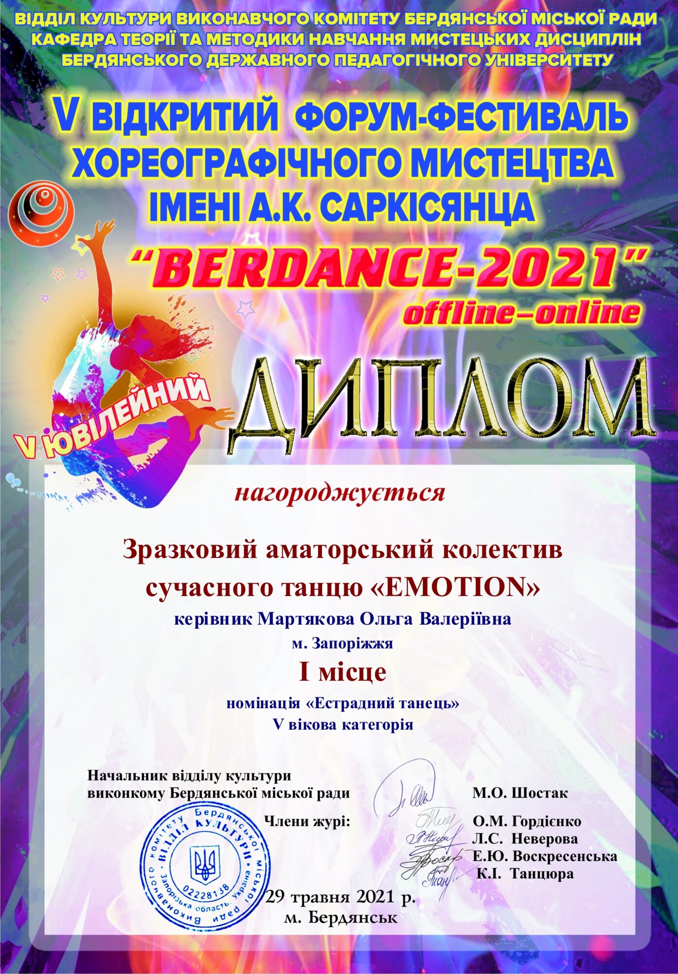 У Бердянську відбувся V Ювілейний відкритий⠀форум-фестиваль хореографічного мистецтва ім. А.К. Саркісянца «BERDANCE 2021». Цього року фестиваль розділили на два етапи: онлайн і офлайн. В онлайн режимі до участі долучились 1300 учасників зі всієї України.