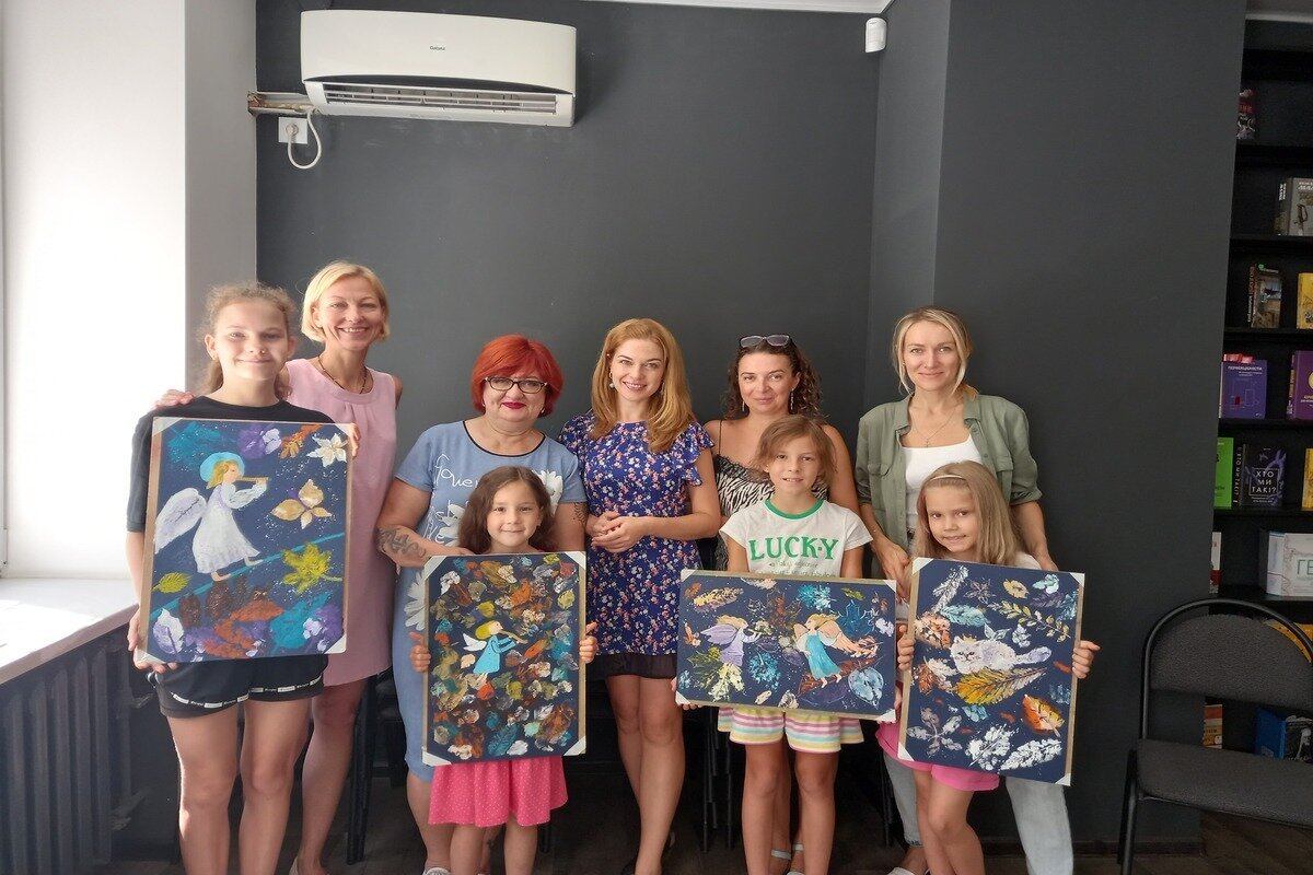 За допомогою техніки малювання гуашшю на тонованому папері мами й доньки створили спільну сімейну картину «Музичний янгол».