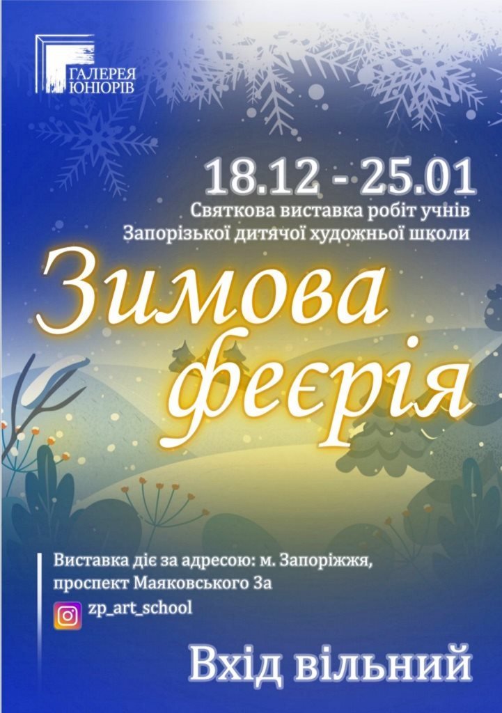 18 грудня 2020 року в «Галереї ЮНІОРІВ» дитячої художньої школи (проспект Маяковського,3а) відбулося онлайн - відкриття святкової виставки творчих робіт учнів ДХШ «Зимова феєрія», яка присвячується Новорічним святам 2020 року. На виставці експонуються 36 робіт авторів віком від 5 до 17 років. Запис онлайн - відкриття виставки можна знайти в соціальній мережі «Instagram» за адресою: zp_art_school.