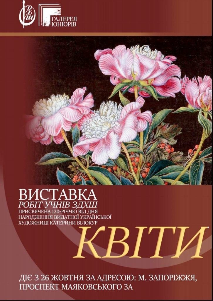 26 жовтня 2020 року в «Галереї ЮНІОРІВ» дитячої художньої школи (ДХШ) (проспект Маяковського, 3-а) відбулось он-лайн - відкриття виставки творчих робіт учнів ДХШ «Квіти», яка присвячується 120-річному ювілею Катерини Білокур – відомої української художниці, майстра народного декоративного малярства, представниці «наївного мистецтва», Народного художника України. На виставці експонуються 59 робіт, 55-ти авторів віком від 6 до 16 років.