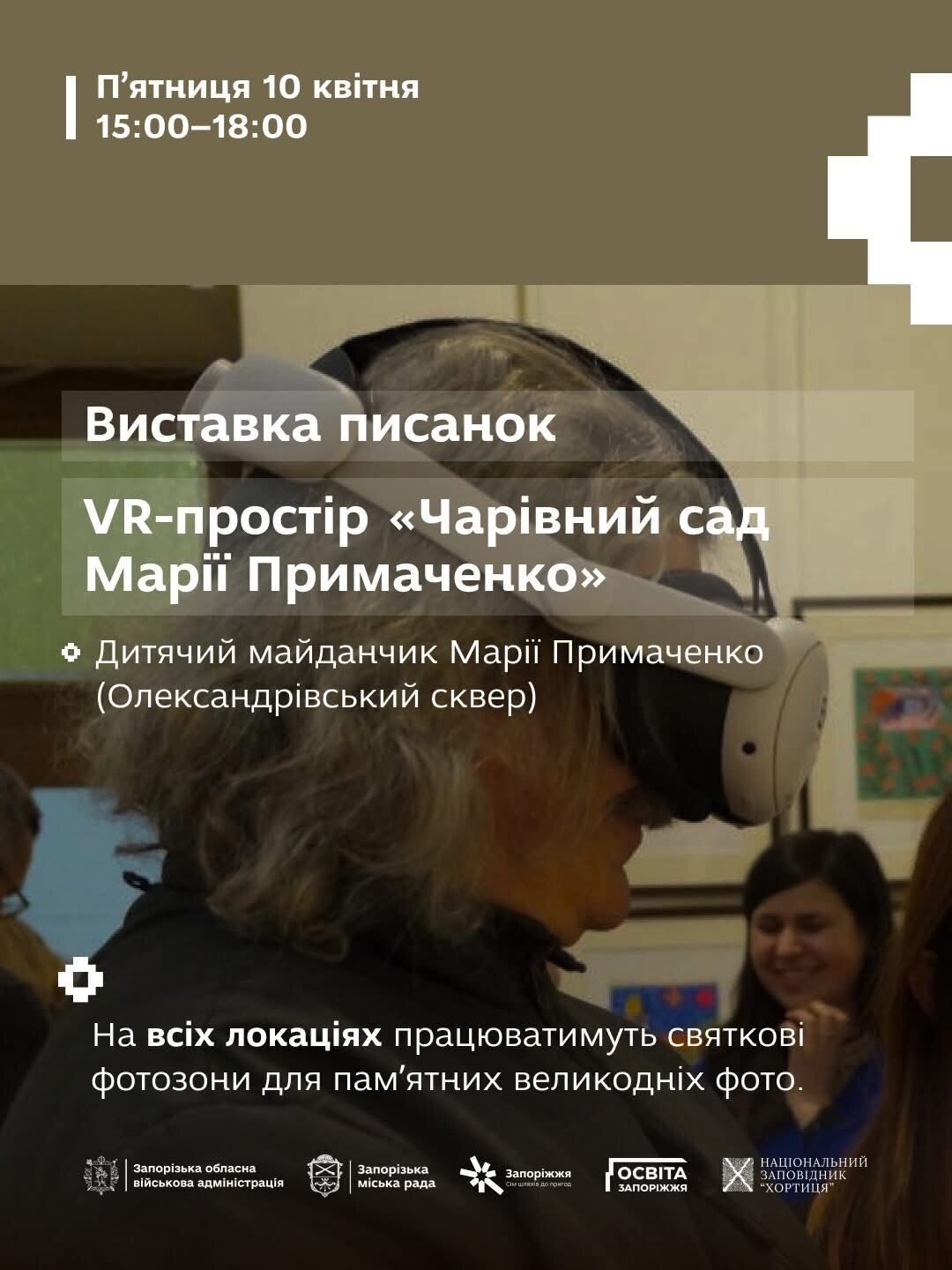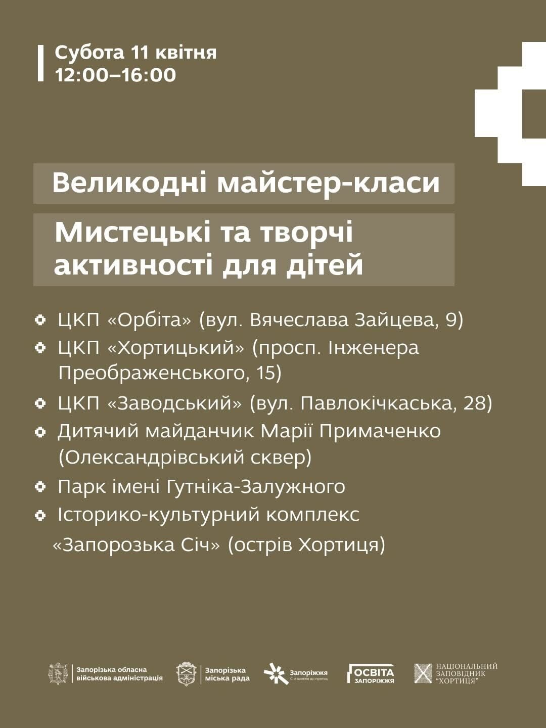 У програмі — творчі майстер-класи, великодні фотозони, мистецькі інтерактиви, виставки писанок та святкова атмосфера, що об’єднує покоління навколо українських традицій. На всіх локаціях працюватимуть святкові фотозони, а також проходитимуть великодні майстер-класи від викладачів мистецьких шкіл, закладів позашкільної освіти та громадської організації «Запорозькі берегині».