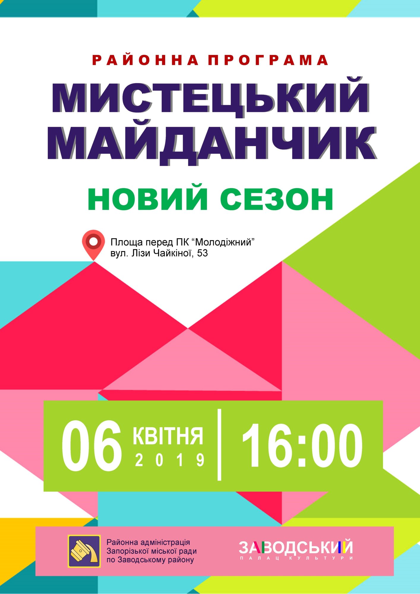 06 квітня районна адміністрація міської ради по Заводському району та палац культури «Заводський» запрошують містян на відкриття третього сезону районної програми «Мистецький майданчик». У програмі: яскраві концертні номери творчих колективів палацу культури «Заводський», цікаві і веселі конкурси для дітей і дорослих.