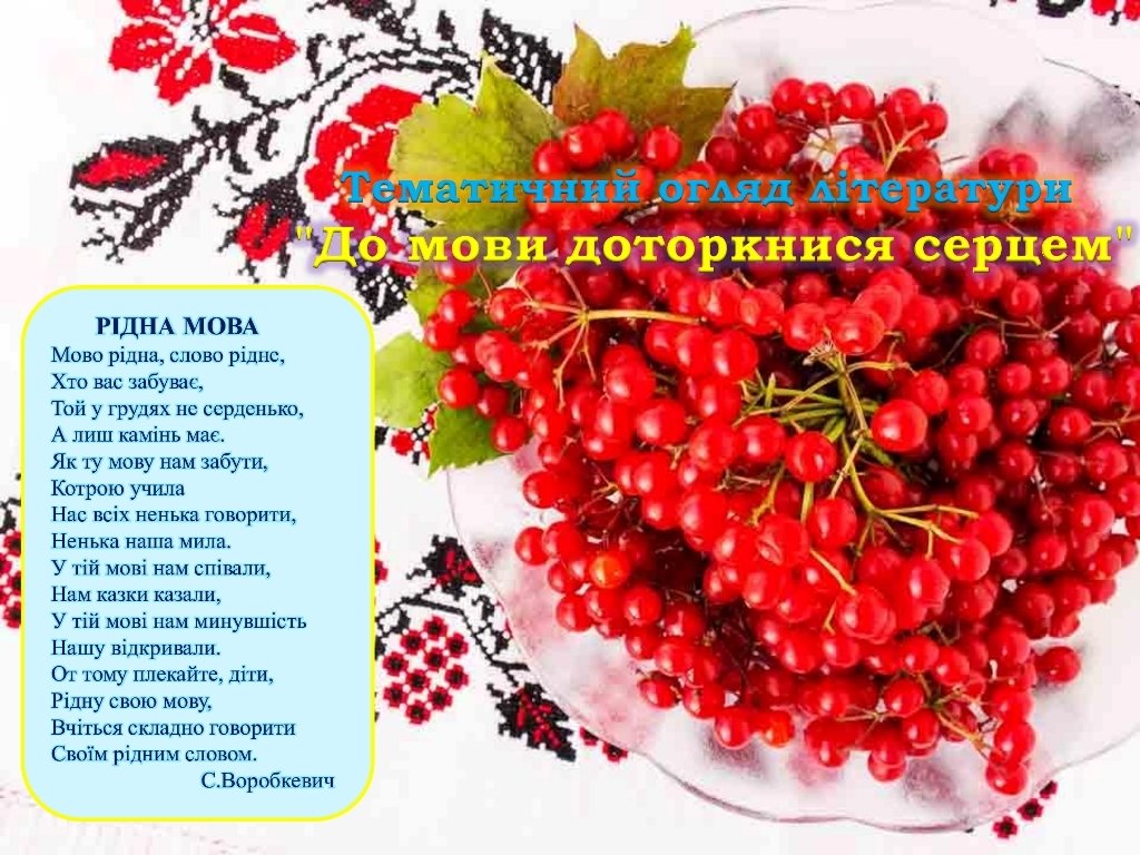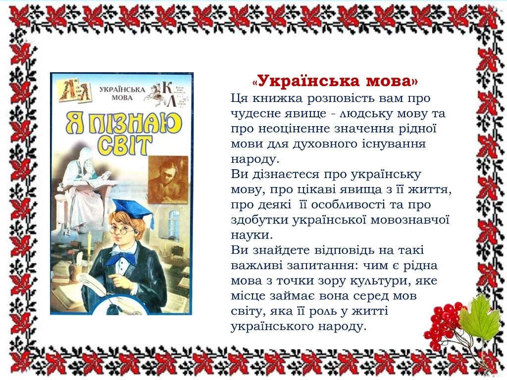 Знання рідної мови свідчить про високоосвіченість, духовність, культуру людини. І тому українську мову треба знати, вивчати, спілкуватися нею. Але ж «Навчати без азбуки й без книг — це все одно, що писати бесіду на воді», — казав Кирило Філософ. Тож пропонуємо вам ознайомитися з тематичним оглядом книг «Моя чарівна українська мова».