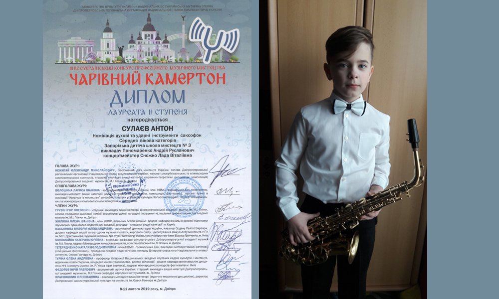 Сулаєв Антон - Лауреат II ступеня (викладач Пономаренко А.Р., концертмейстер Снєжко Л.В.).