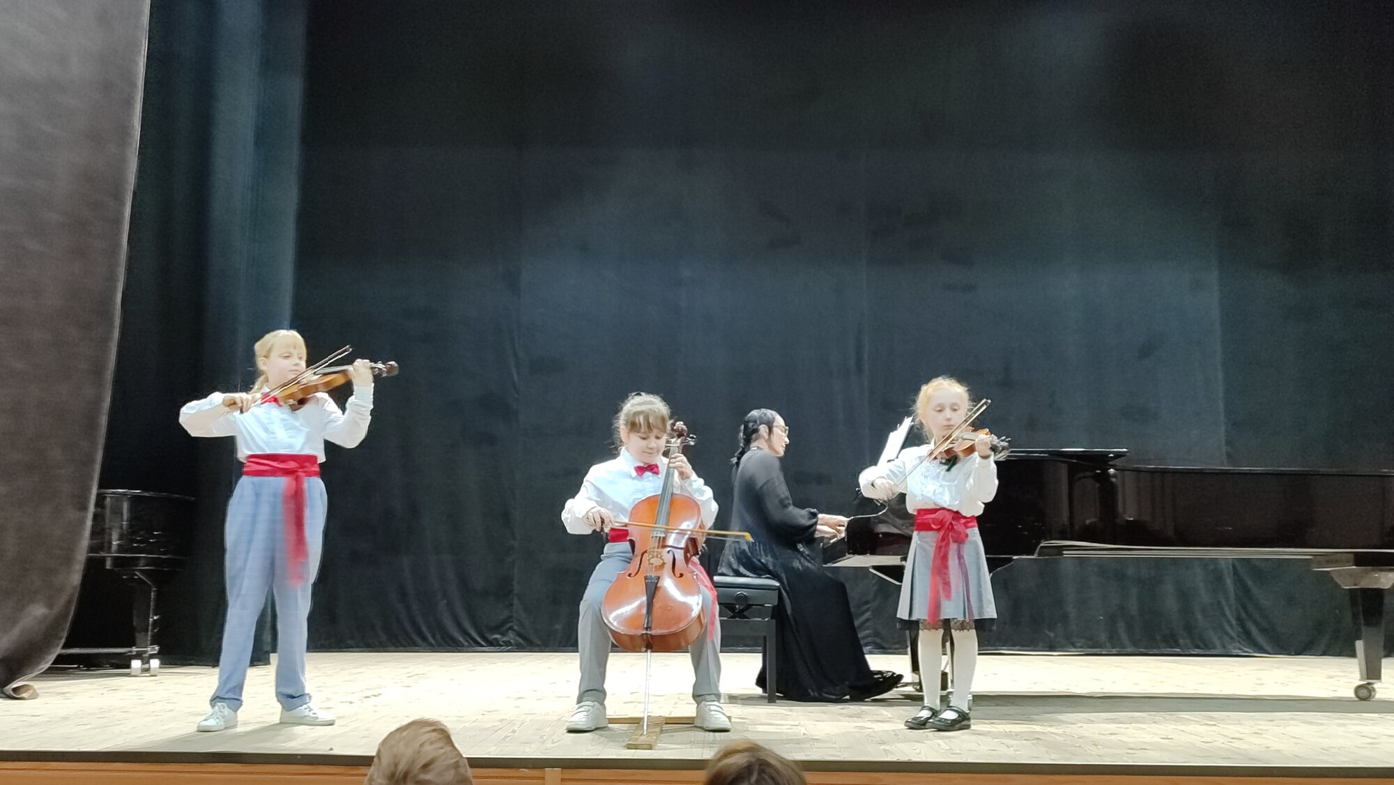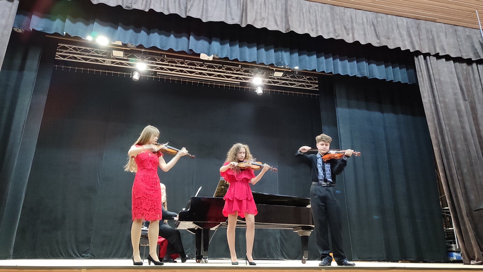 І місце - тріо скрипалів: Євсєєва Поліна, Циммерман Ірена, Жаболенко Данііл, викладач Чуча Л.В., ЗДМШ №1