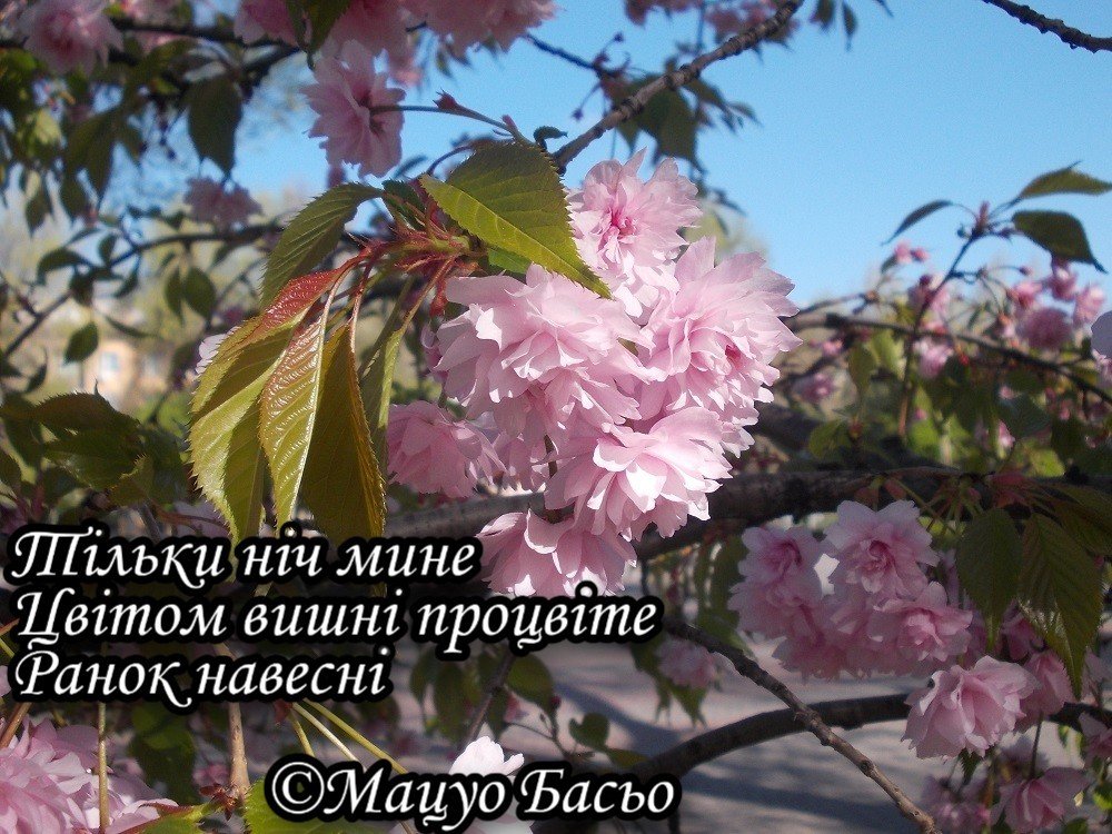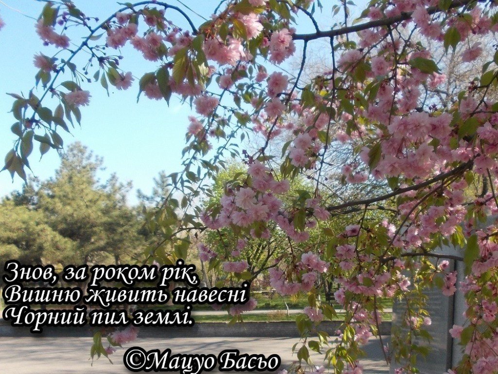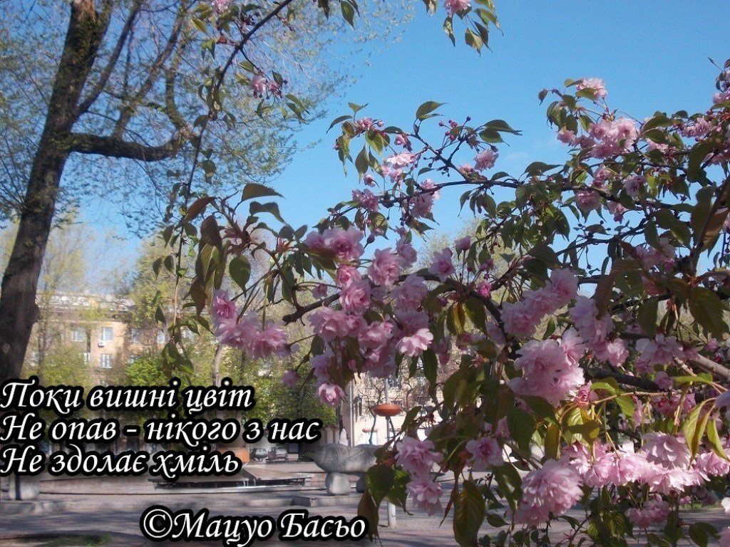 На площі Маяковського цвітуть сакури – символ краси в японській поезії. Ця вишня оспівана кращими поетами Ямато упродовж віків. Один з них – лірик XVII століття Мацуо Басьо - неперевершений майстер жанру хокку.