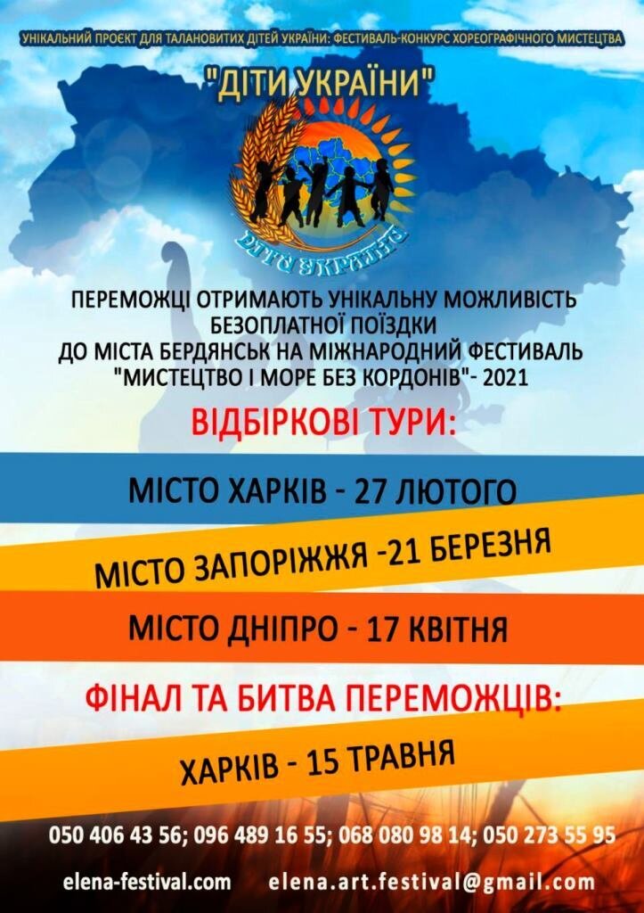 Шановні друзі, колеги, керівники хореографічних студій, колективів, шкіл! До Вашої уваги пропонуємо унікальний Всеукраїнський фестиваль-конкурс хореографічного мистецтва - «Діти України», який відбудеться у 3 відбіркові тури в мм. Харків, Запоріжжя та Дніпро. Фінал переможців відбудеться в місті Харкові!