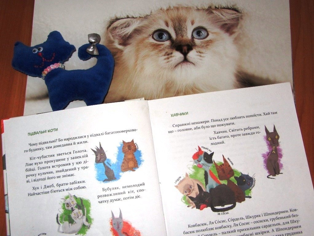 А ще більше дізнатися про погляди кішок та їхнє життя серед людей можна з фантастичної повісті Катерини Булах «День кота», бо її героїні, дві подружки, Настя і Кароліна, у перший же день канікул перетворюються на… кішок! Їх мандри та пригоди допомагають побачити себе збоку, очима чотирилапих, яких ми інколи навіть не помічаємо.