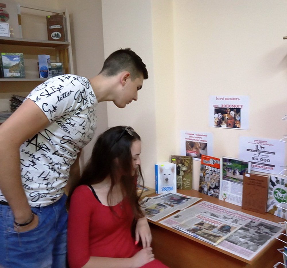 Видання, представлені на тематичній полиці «Їх очі волають про допомогу», розповіли про дієві заходи на допомогу безпритульним тваринам, які може здійснити кожний громадянин, та доповнили бібліотечну зустріч інформацією щодо притулків для тварин в Україні.