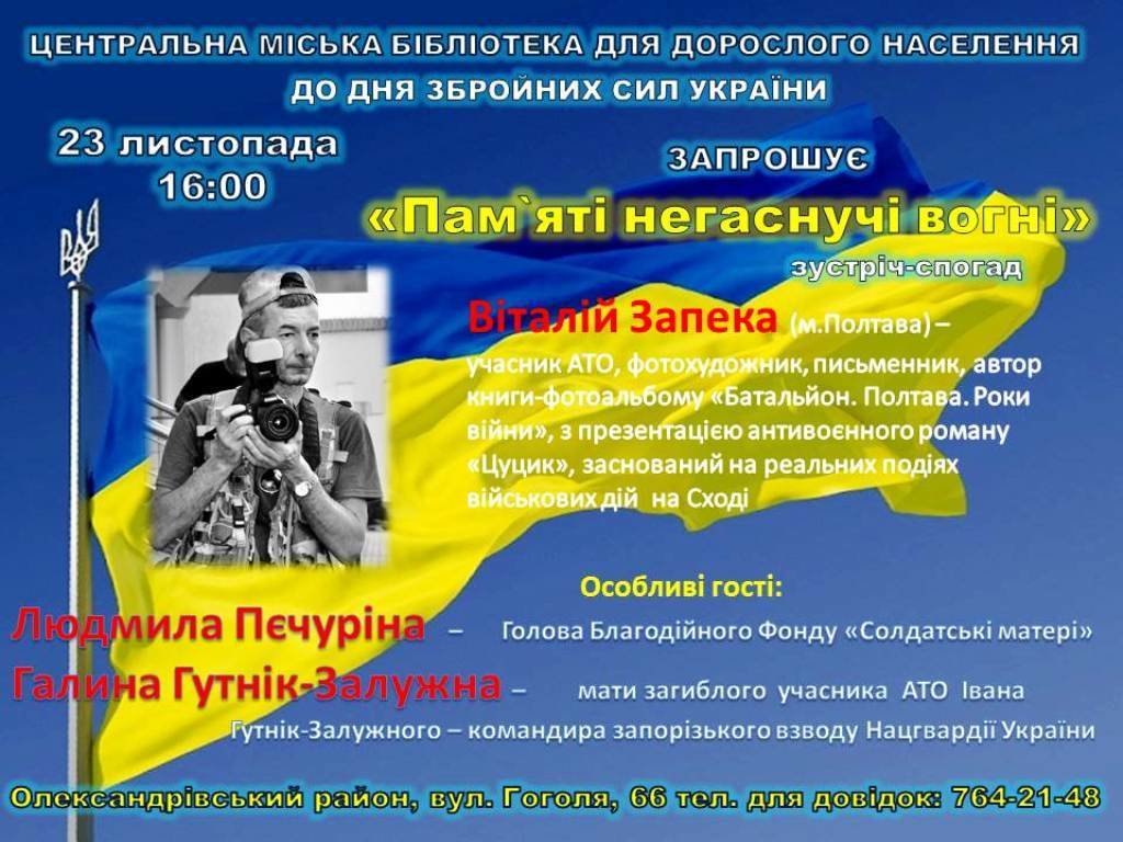 На гостей бібліотеки чекає знайомство з талановитим письменником, професійним фотохудожником, автором книги-фотоальбому «Батальйон. Полтава. Роки війни», учасником АТО Віталієм Запекою, який вперше в Запоріжжі презентує свій антивоєнний роман «Цуцик», заснований на реальних подіях військових дій на Сході.