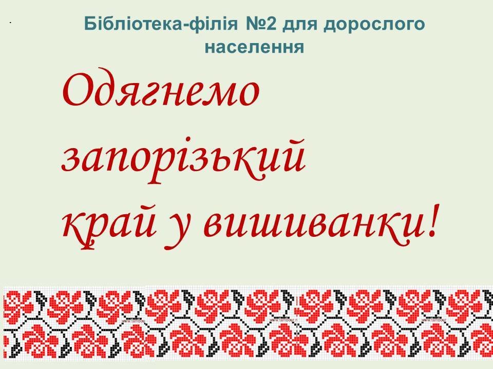 Бібліотека для дорослого населення №2 (пр.Маяковського,7, Вознесенівський район) вітає всіх запоріжців та гостей міста з Днем вишиванки!