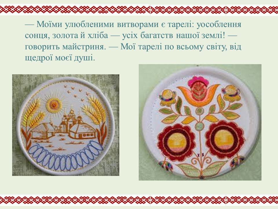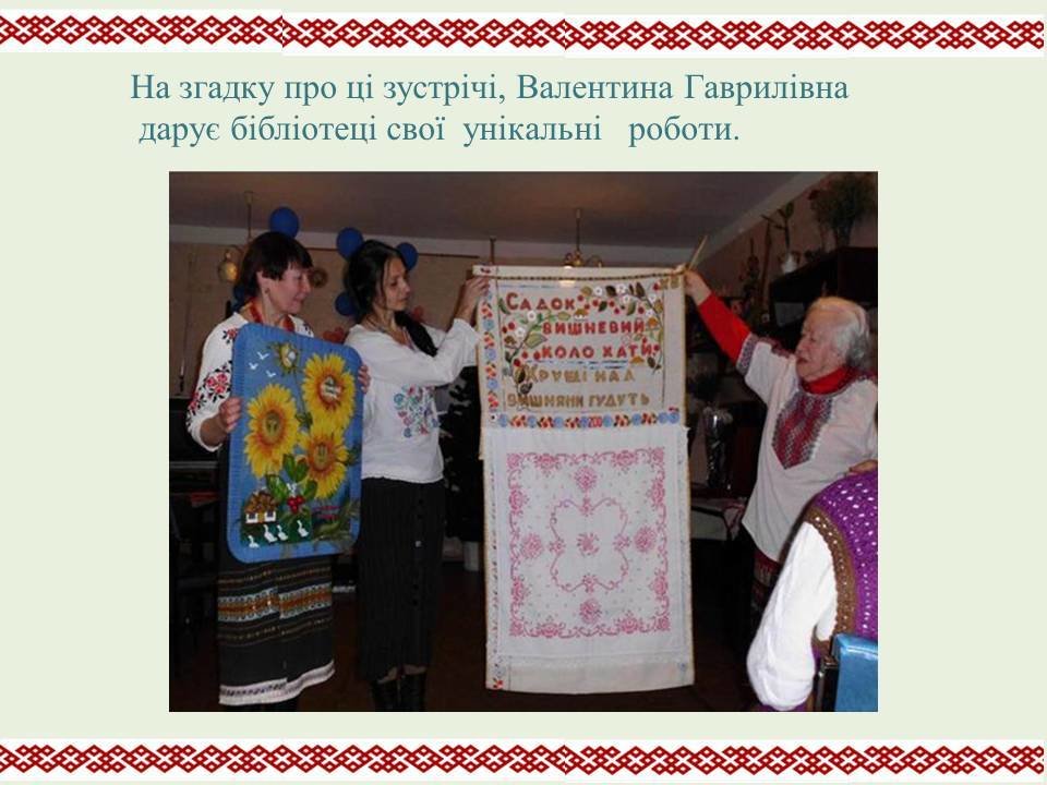 У доробку Валентини Гаврилівни більше 3000 авторських робіт та понад двісті видів швів! Творчу працю вона успішно поєднує з наставницькою діяльністю, навчає і передає свій досвід молодим майстриням.